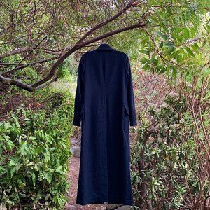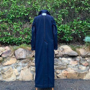 Elegant, timeless navy wool duffel coat, duster length, perfect for when you're wearing a dress, gown, or tall boots. Classically structured but contemporary in it's chic slim fit, not at all heavy, coarse, or stiff. The A.L.C. designers known for their clean lines and feminine cuts, designed this duffle coat with precision and sophistication in mind, with lengthy back slit for wide strides, zippered sleeves to go over gloves, traditional front storm flaps, rope, horn toggles, and leather fastenings , zippered closure, front flapped pockets, and an additional mid waist slim pocket . The tailored silhouette hangs beautifully on the body. The hood was never needed and got stored somewhere. Will send if I find it. Measures 52" length, armpit to armpit 18", size 4. Made in the US of imported Italian wool blend fabric. Excellent condition.