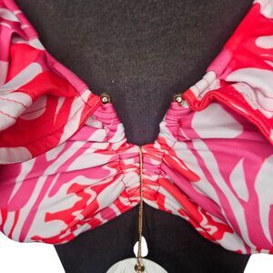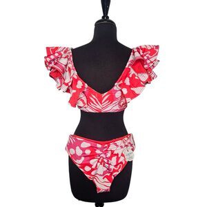 New with tags! ALCATRAZ Swimwear Monarca Bikini. Ruffled shoulders. Wireless. Padded. Size 38 Top. Size Large Bottoms. Cheeky cut. Ruched back. Pink, orange and white. Handmade in Ecuador.