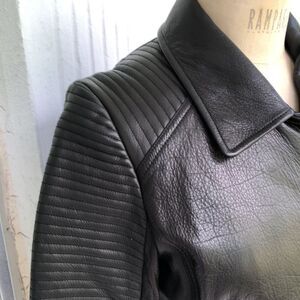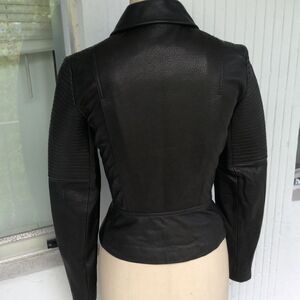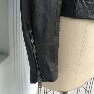 Fabulous leather jacket that has ribbing through the shoulders and the top of the sleeves. Zippered sleeves and zippered pockets. In great condition. Measuring across the shoulders it’s 15 inches, pit to pit is 17 inches through the bottom is 16 inches from the top of the shoulder to the bottom of the jacket is 21.5, sleeves are 24.5. Measurements are approximate