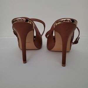 Love these heels color brown with a little gold only tried them on but unfortunately are a little to high for me