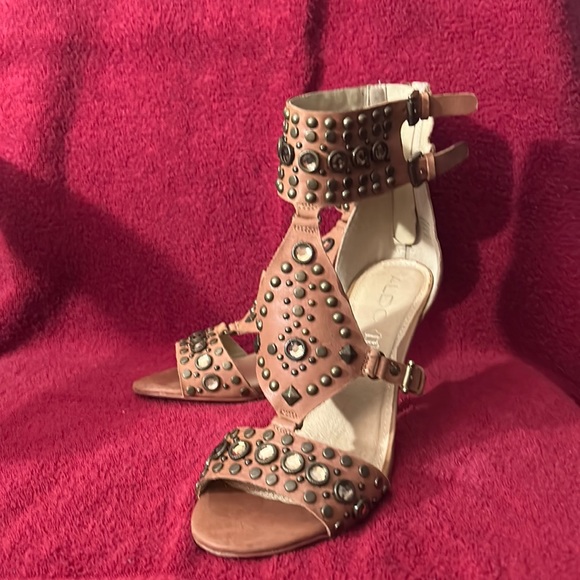 Aldo studs and gems open toe heel sandals zipper back buckle ankle design natural wood heels NICE! Still in original box