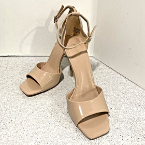 ALDO size 9M nude patent finish high heel dressy shoes. These are strappy open toes with adjustable ankle strap and sexy stiletto high heels. These are a must-have for any fashion forward woman - they will go with everything! In excellent pre-owned condition - there is one small scuff on one heel (see pic) but the soles look unworn and these could be mistaken for brand new!