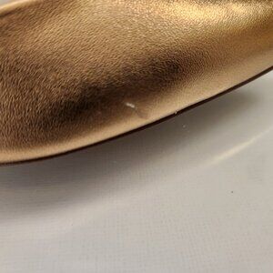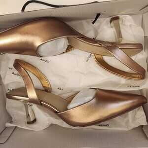 ALDO "Basanti" Leather Slingback heels. NIB. Size 6. NIB/Original box/packaging. No tears/peeling/wear. One small indent/mark on the back of one heel (show a little of the under white material but not peeling, more of an indent). Heel height: 2.5 inches. Point toe. Gold. Smoke free home. Box has minor damage. All offers are welcome. Thank you!