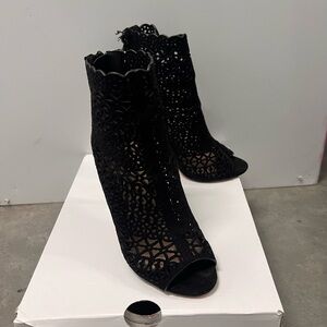 Chic black lace heels with peep-toe design. Elegant and stylish for any event.