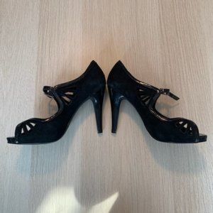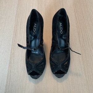 ALDO Black Suede peep-toe heels with Mary Jane detail.