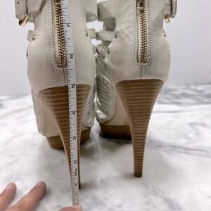 Aldo super cute platform strappy heels. Color is a distressed white leather. Zipper in back. Buckle strap around ankle. Size 9/40