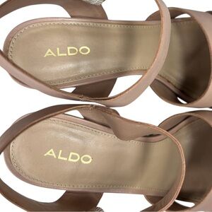 Elevate your style with these chic ALDO nude blush pink ankle strap block heel sandals, perfect for work, brunch, or a night out. Featuring a comfortable 3-inch stacked wooden block heel, wide toe straps for support, and an adjustable ankle buckle with gold-tone hardware for a secure fit.