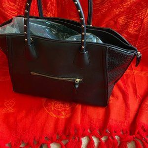 ALDO LIGHTLY USED BLACK HANDBAG WITH GOLD STUDS ON THE HANDLES. THERE IS A ZIPPER POCKET ON THE OUTSIDE OF THE BAG AND A ZIPPER POCKET ON THE INSIDE. THERE ARE ALSO TWO POUCH POCKETS ON THE INSIDE. VERY ROOMY.