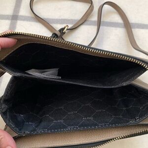 ALDO small light brown/tan faux leather and suede crossbody purse. Strap has a buckle to adjust the length. Gold toned hardware.