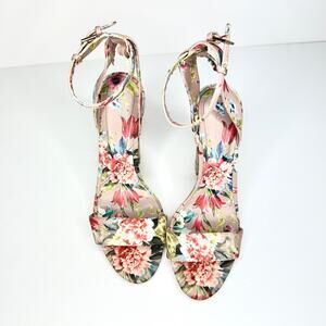 Keywords: [ALDO], [strappy sandals], [floral print], [block heel], [grosgrain fabric], [ankle tie], [women's shoes], [multicolor], [casual chic], [party footwear], [pre-owned], [fashion], [comfort], [adjustable fit], [vibrant].