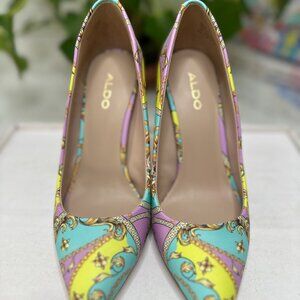 Add a pop of color and fun to your outfit with these stunning ALDO heels! Featuring a playful pastel print in yellow, turquoise, and lilac tones, these pointed-toe pumps are perfect for spring and summer looks. A sleek silhouette and bold design make them ideal for brunch dates, parties, or turning heads at the office.