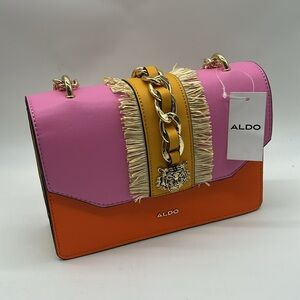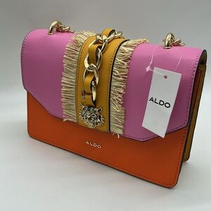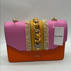 Make a bold statement with this stunning ALDO crossbody bag! Featuring a unique colorblock design in pink and orange, this structured bag is accented with mustard yellow trim, gold-tone hardware, and a fierce tiger emblem. Decorative fringe and a chunky chain elevate the look, while the adjustable chain strap lets you wear it on the shoulder or crossbody.