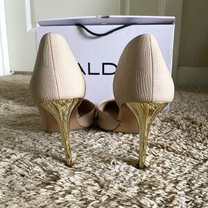 These beige ALDO heels are so elegant with their pointed toe and sculpted gold stiletto heel, the perfect mix of timeless and bold. The subtle croc-textured finish adds a chic touch that pairs effortlessly with everything from wedding guest dresses to business looks.