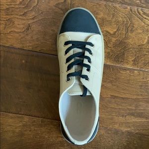Cream and black leather excellent condition, no scuffs, very clean and look new! A comfy retro looking shoe.