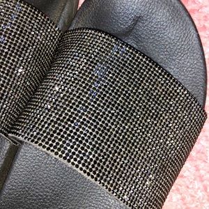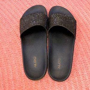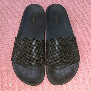 Black Aldo slides with black mini jewels. A few jewels are missing on the sides but other than that slides are in great condition!