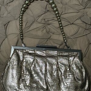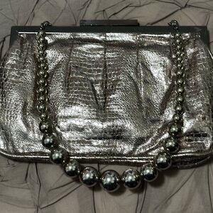Elegant silver metallic women's bag with a stylish beaded handle. Perfect for evening outings and special occasions.