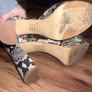 Bold snake-print heels by ALDO featuring a sturdy platform heel, round toe and adjustable ankle straps. Neutral black/white pattern pairs easily with night-out looks, denim, or dressy outfits. Size 7. Measurements shown in photos include heel height and platform. Light wear on soles — overall great statement shoe.
