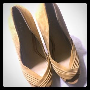Tan suede peep toe stilettos by ALDO. Worn very little.