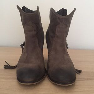 Distressed ALDO booties with a western inspired silhouette. Side zips and 3.5in stacked heel. Very comfortable and perfect with jeans or a dress! Size 7.5, gently worn.