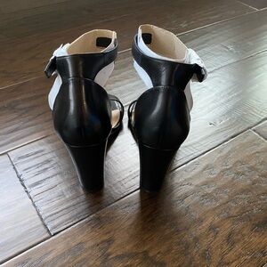 ALDO women's Jerayclya Heeled Sandals' black, almond toe shape. Heel Height: 3.75 in.