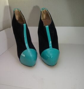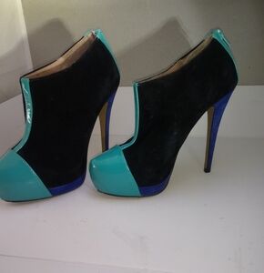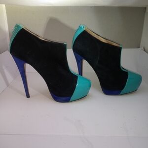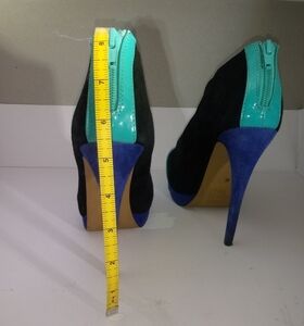 ALDO 5 inches heels with a comfortable platform with Suede & Patent leather featuring a color lock of cobalt blue suede heel, black suede body and turquoise patent leather toe