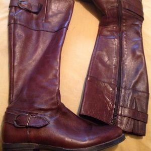 Brown leather riding boots still in good condition after being worn several times.