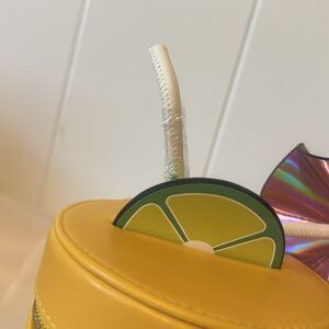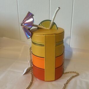 Elevate your vacation-ready look with this fun crossbody bag showcasing a whimsical citrus cocktail-inspired design and a gleaming chain strap. Features a lime wedge with a straw on top and a pink holographic umbrella to top it off.
