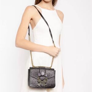 Black embellished sling bag, has a button closure 1 main compartment, has 3 inner pockets With a non-detachable sling strap