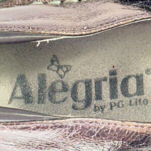 These Alegria by PG Lite Mary Jane shoes feature a metallic leather upper, adjustable strap, and cushioned insole for enhanced comfort and durability.