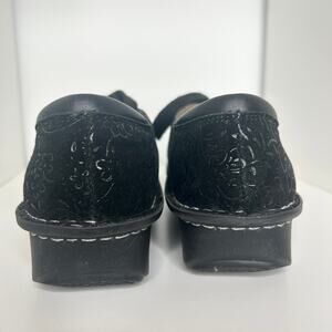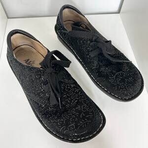 Textured leather upper with silver contrast stitching and matching black laces. Black with floral design. Generous toe box so toes can spread out. Polyurethane outsoles engineered to provide a natural rocker walking motion. As always with Algeria, excellent arch support.