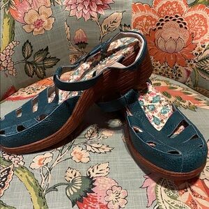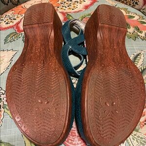 Stylish teal strappy sandals with a floral insole. One piece bottom sole. Leather uppers. Perfect for casual outings.