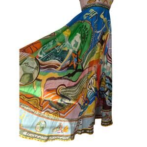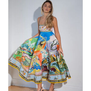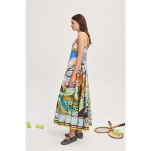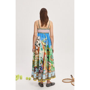 The ALÉMAIS Lucky Pace Shirred Linen Midi Sun Dress features a vibrant print with playful sporty motifs and Greco-Roman stripes, crafted from breezy linen with a fitted bust and flowing skirt for effortless charm.