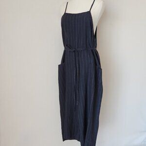 ALEMBIKA Linen Pinstripe Wide Leg Capri Jumpsuit Tie-Waist Pocket Navy Blue
