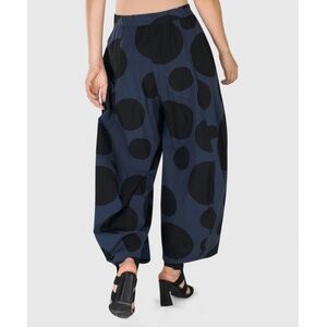 These ultra-fun barrel leg pants have a chic, architectural shape and are high-waisted with a zipper, button closure and elastic back, plus two roomy side pockets.'
