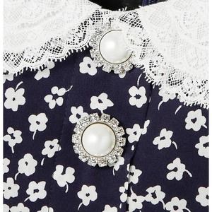 Details: Daisy print all over. Lace collar. Faux pearl buttons at front. Fit-and-flare silhouette. Concealed zip fastening along back. 100% Silk. Approx. 18" pit to pit, 15" waist and 34" in length.