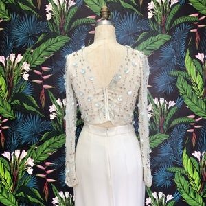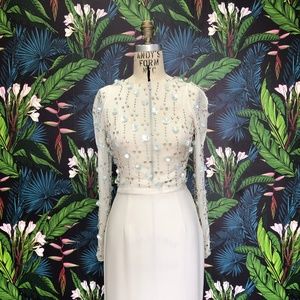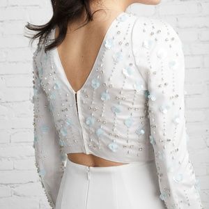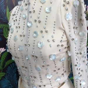 Description: Long sleeve top hand embellished with blue haze hand curled sequin rosettes and stones