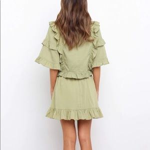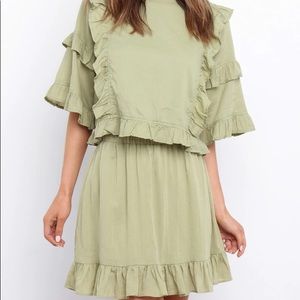 ruffle detail on arms, bodice and hemline