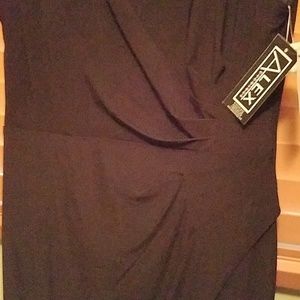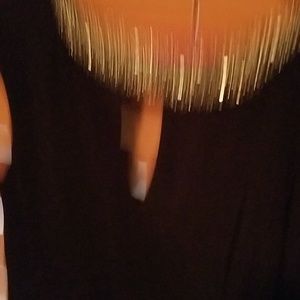 Evening dress with beautiful silver sparkle collar has fitted side and nice curve up bottom very complimenting on . Has a u shaped back with zipper never worn
