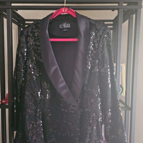 Alex Evenings Woman Black Peplum Sequin Blouse/Jacket Size XL, Center back length 23.25" 3/4 sleeve, Blouse/Jacket 92% Nylon, 8% spandex. Collar 100% Polyester. All Over Stretch Sequin with Satin Collar. Side closure with Single Button and Peplum Hem. New with tags.