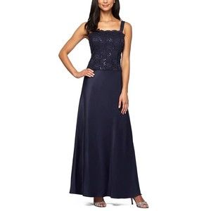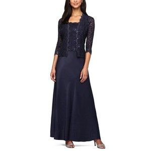 Elevate your style with this stunning ALEX EVENINGS lace and satin gown with lace jacket in blue. Perfect for any formal occasion, this dress features a square neckline, 3/4 sleeves, and a zip closure. The ankle-length skirt and maxi length of the lace jacket add elegance to the outfit.