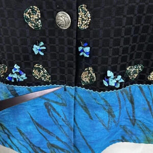 Colorful mandarin collar jacket by ALEX KIM in size M. 5-button front with bling embellishments and boho hippie vintage embroidery. Ideal for women who love unique and stylish outerwear.