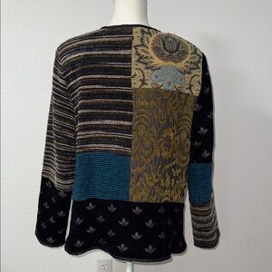 This stylish women's jacket features a unique patchwork design with a blend of black, blue, and brown tones. Perfect for adding a touch of elegance to any outfit.