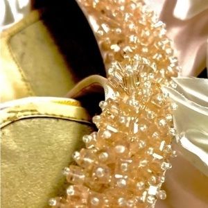 Barbie definitely has these shimmering pumps in her closet! Soft pink with gorgeous beading across the toes, adjustable ankle straps for the perfect fit and iridescence shimmering across the back…they’re absolutely stunning! The outer is covered in the most iridescent fabric that vibes like beautiful mermaid scales…perfect for dancing with the smaller kitten heel.
