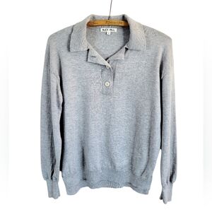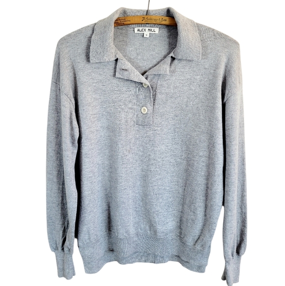 ALEX MILL - Polo Collar Long Sleeve Sweater in Heather Heathered Grey Gray, Side Split Hemline, Button Neck. Size Small. Laid flat it measures approx. 20" armpit to armpit, 23.5" Top shoulder to hem, 24" Sleeve. Good pre-owned condition, one very light and Small mark to front middle area ( see close-up), Missing Interior fabric care content label but believed to be Cotton, all else is well preserved. Smoke/ Pet free environment. Bundle purchases to save greatly on shipping! #15/8
