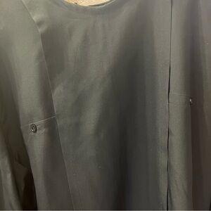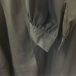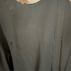 This is a lovely black silk blouse with decorative buttons on the front and a single pleat on each side.