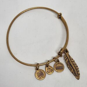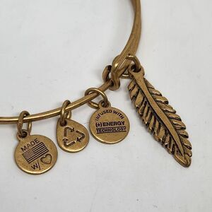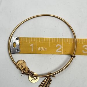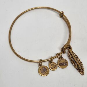 Gold tone adjustable bangle with a feather charm. There is some slight wear on the finish. Please see all photos as this is the exact piece you will receive. Thank you for looking. I am always open to reasonable offers. Have a fantastic day!