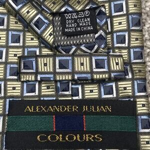 This Alexander Julian Colours tie features a sophisticated blue and green check pattern, perfect for adding a touch of elegance to any outfit. Measuring 3.5" in width and 58" in length, it's an ideal accessory for both professional and casual occasions. This tie is new without tags, a shelf pull, and is in excellent condition, ready to enhance your wardrobe with its timeless style and quality craftsmanship.
