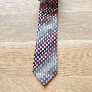 Alexander Julian Colours mens necktie. This is an awesome mens necktie with multi colors and patterns. Silver, red, yellow, black, and tans. This tie is in great pre loved condition with no major flaws. 100% Polyester and hand made.