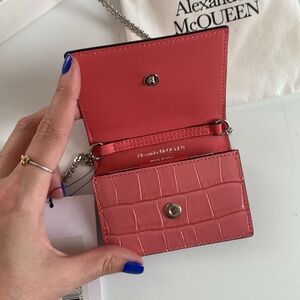 NWT | Alexander McQueen | Coral mini card holder on silver chain | Approx. 4x3โ | Croc embossed leather | Silver skull with gemstone eyes on front | Comes in original box and dustbag | Authentic | Strap drop is approx. 22โ