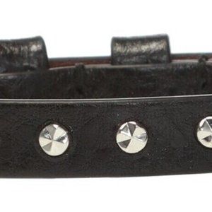 Single wrap studded skull charm bracelet by Alexander McQueen. Buckle fastening. Adjustable fit. Engraved logo. Silver tone hardware. Material: 100% Calf Skin. Color: Black. Size: ONE SIZE (adjustable). Measurements (approx.): 8-1/2" (22 cm) length x 3/8" (1 cm); Pendant Width: 1/2" (1.5 cm). Made in Italy. MSRP: USD $290. BRAND NEW with original AMQ branded dust bag and box.
